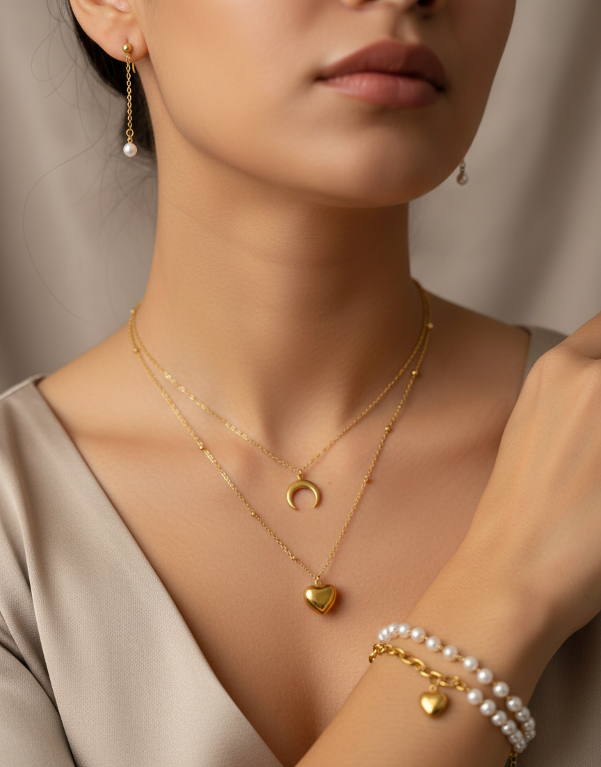 Layered Necklace Duo: A two-tier necklace featuring a delicate satellite chain (beaded chain). The shorter layer holds a sleek crescent moon pendant, while the longer layer features a bold, puffy heart charm.