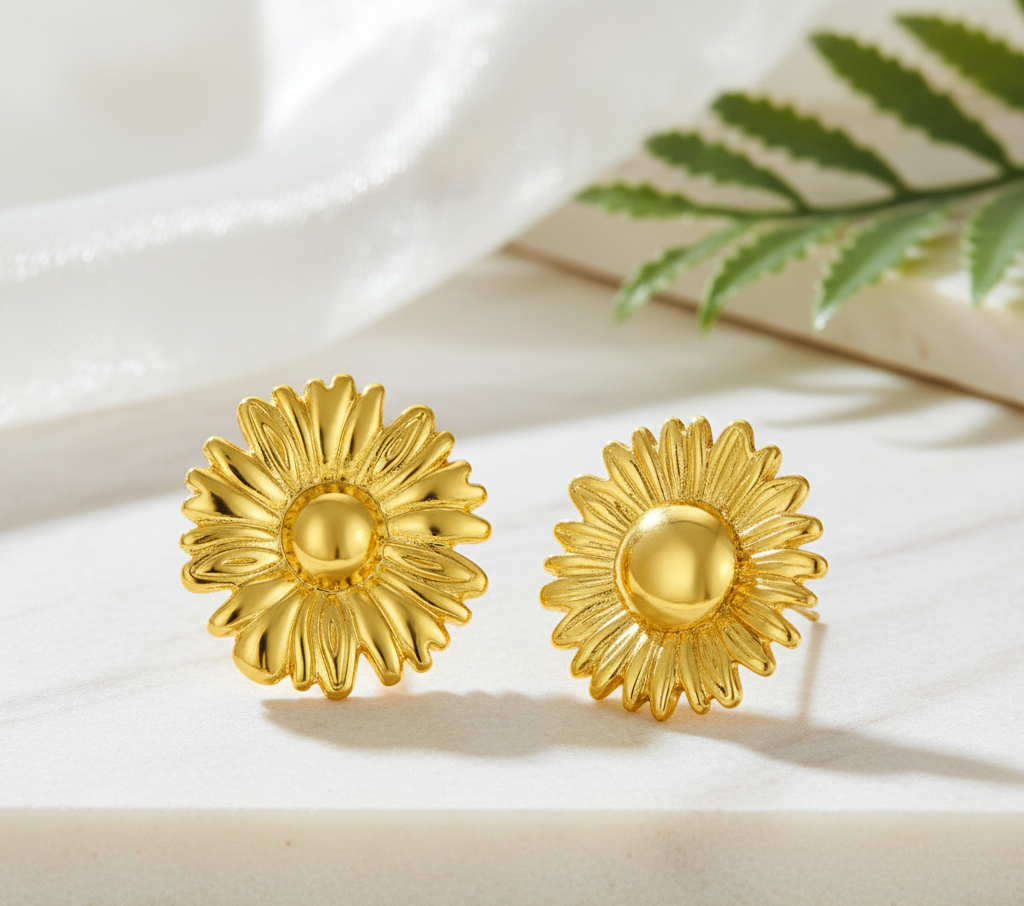Brighten any ensemble with these stunning Golden Sunflower Statement Studs. Expertly crafted to capture the radiant energy of a mid-summer bloom, these earrings feature a multi-layered petal design with a rich, high-polished gold finish. The center of each flower is anchored by a smooth, rounded dome, creating a beautiful 3D relief that catches and reflects light from every angle.
