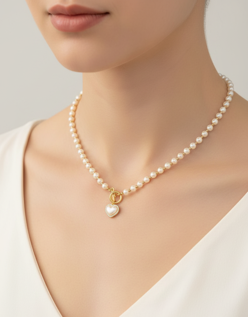 The centerpiece of this elegant strand is a unique front-facing toggle clasp in a rich gold finish, which serves as both a functional closure and a stylish focal point. Suspended from the toggle is a breathtaking heart-shaped pendant. The heart features a luminous pearl-like center, framed by a halo of sparkling micro-crystals that catch the light with every movement.