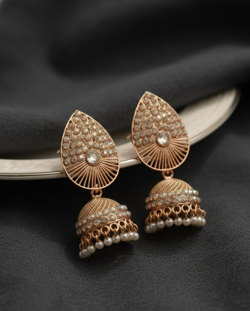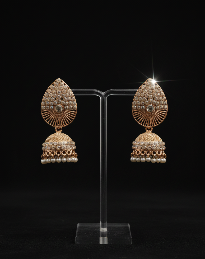 These elegant Jhumka earrings are a perfect blend of regal charm and modern sparkle.Capture the essence of traditional royalty with our Golden Dewdrop Aurora Jhumkas.