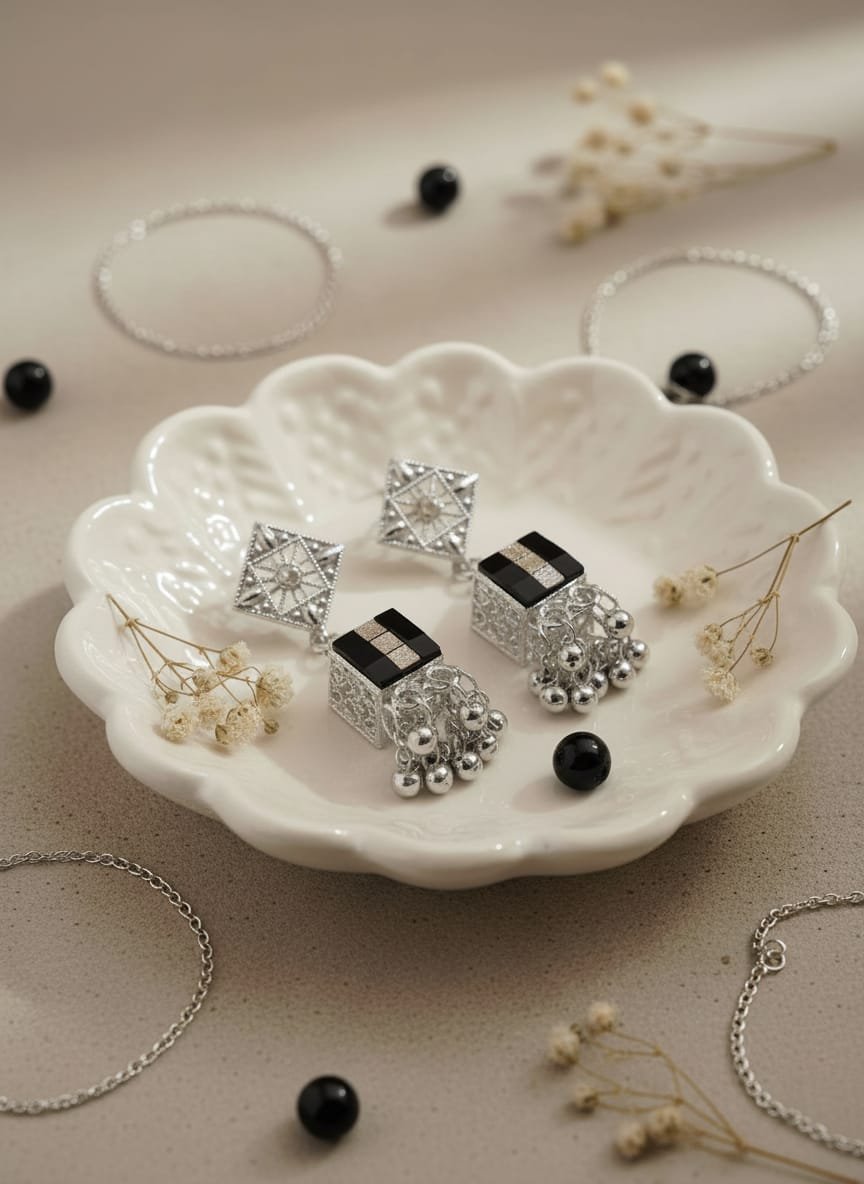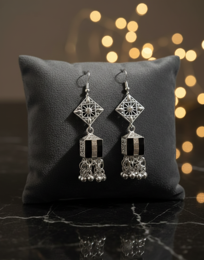 The Cube: Instead of a traditional dome, the “jhumka” element is a hollow silver cube. The top face is inlaid with a polished black onyx-style finish accented by a central silver stripe, while the sides feature delicate filigree cut-outs.