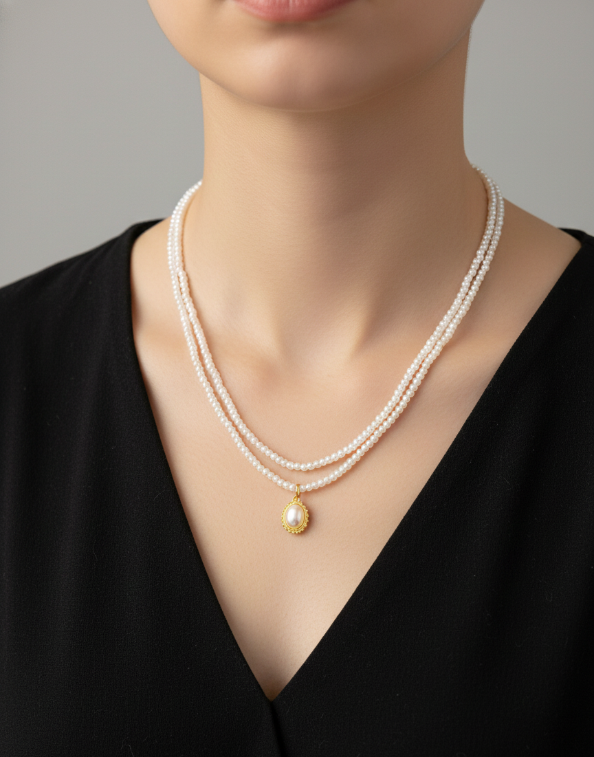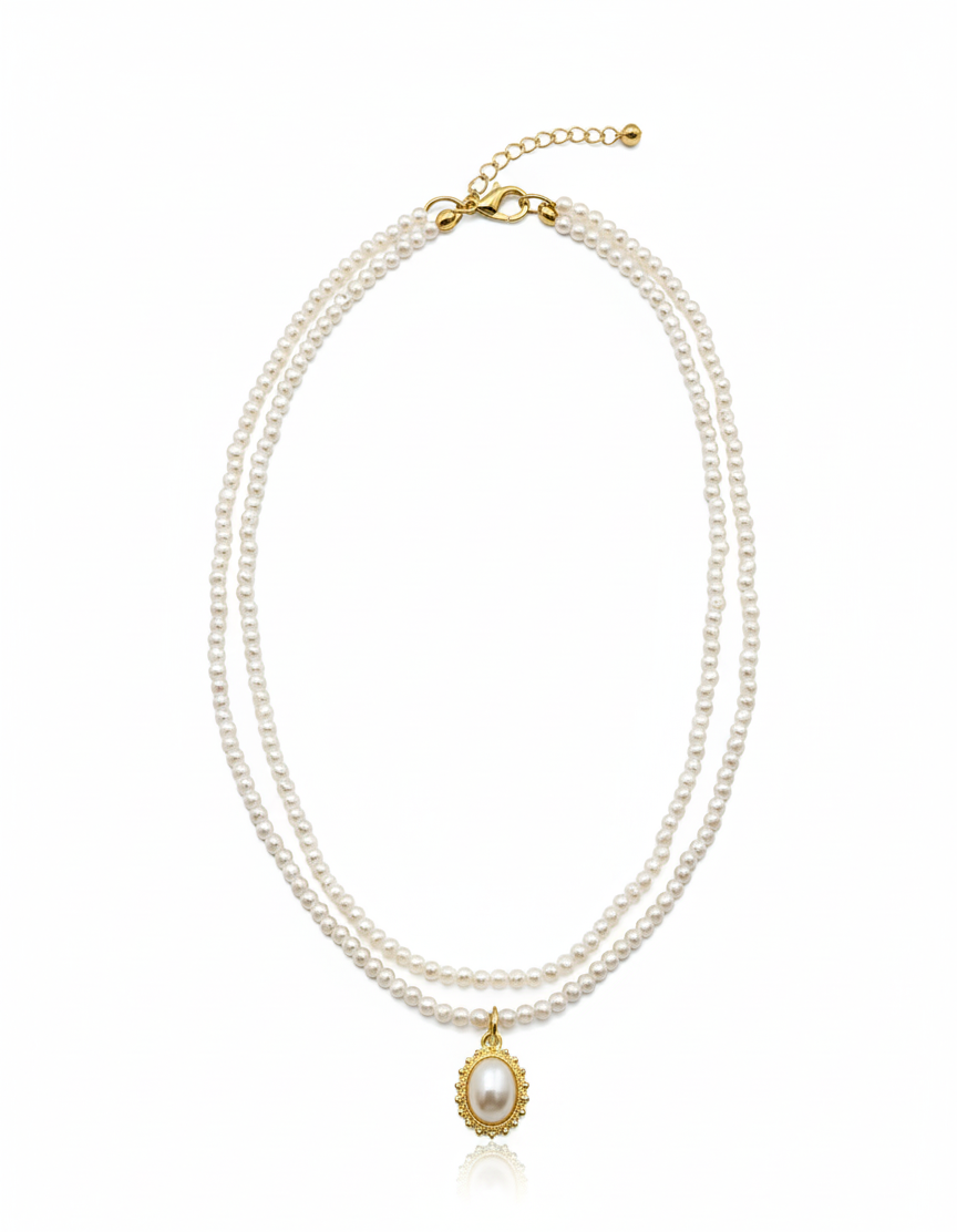 Experience the height of luxury with the Parisian Layered Pearl Necklace. This exquisite piece features two nested strands of petite, high-luster pearls that create a rich, tiered look. The layers are anchored by a vintage-style gold medallion featuring a prominent, oval pearl center and a textured, beaded border. Secured with a lobster clasp and an adjustable extender, this double-strand necklace provides effortless styling that instantly elevates a formal dress or a professional blazer. It is a true statement piece that combines the grace of traditional pearls with the grandeur of regency-inspired design.