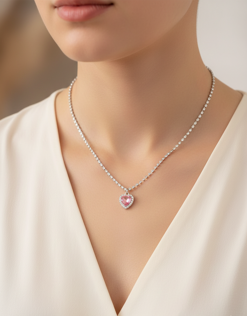 Product Description: Embrace your softest, most romantic side with the Rosé Dream Heart Halo Necklace. This piece is designed for the modern romantic who isn’t afraid to wear their heart on their sleeve—or around their neck. The centerpiece features a mesmerizing, multi-faceted heart-shaped crystal in a soft blush pink, surrounded by a delicate halo of micro-rhinestones that catch the light with every movement.