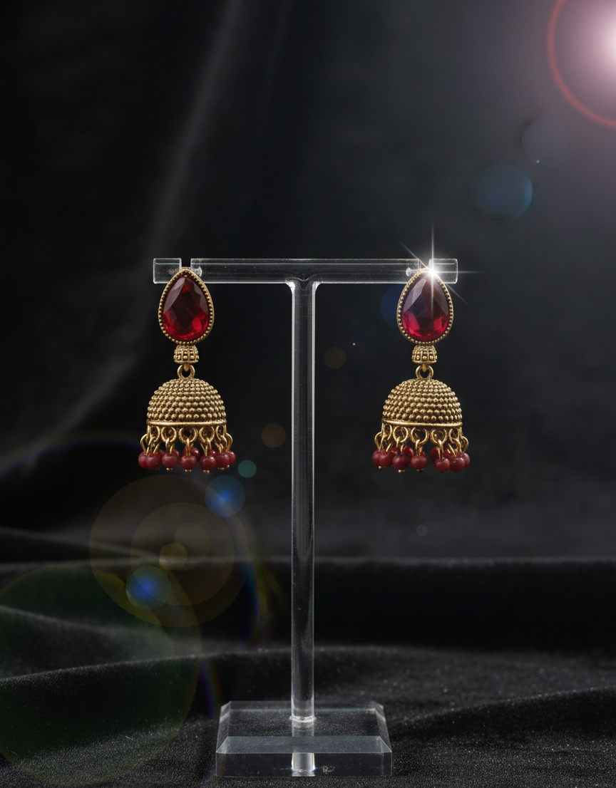 Beaded Accents: The base of the Jhumka is finished with a delicate fringe of matching red beads, adding a layer of sophisticated movement.