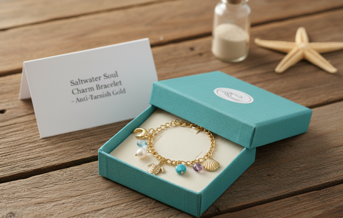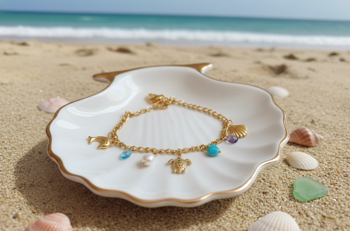 Capture the essence of a permanent summer with the Meridian Bracelet. This exquisite piece features a curated collection of ocean treasures—delicate sea life charms, luminous pearls, and vibrant turquoise accents—set on a shimmering 18k gold-plated chain. Designed for the modern traveler, it is fully anti-tarnish and water-resistant, ensuring its brilliant glow remains even after a dip in the sea.